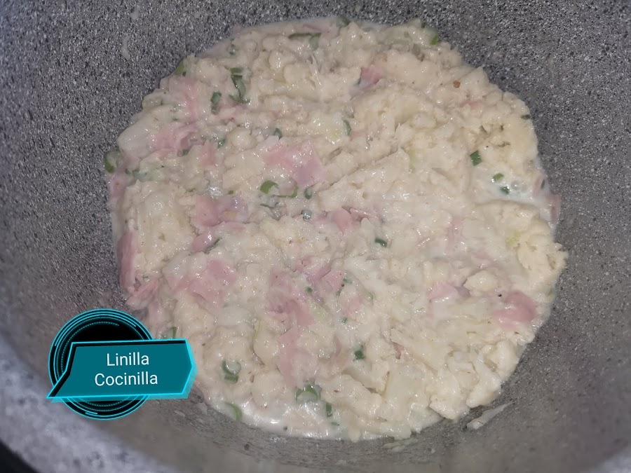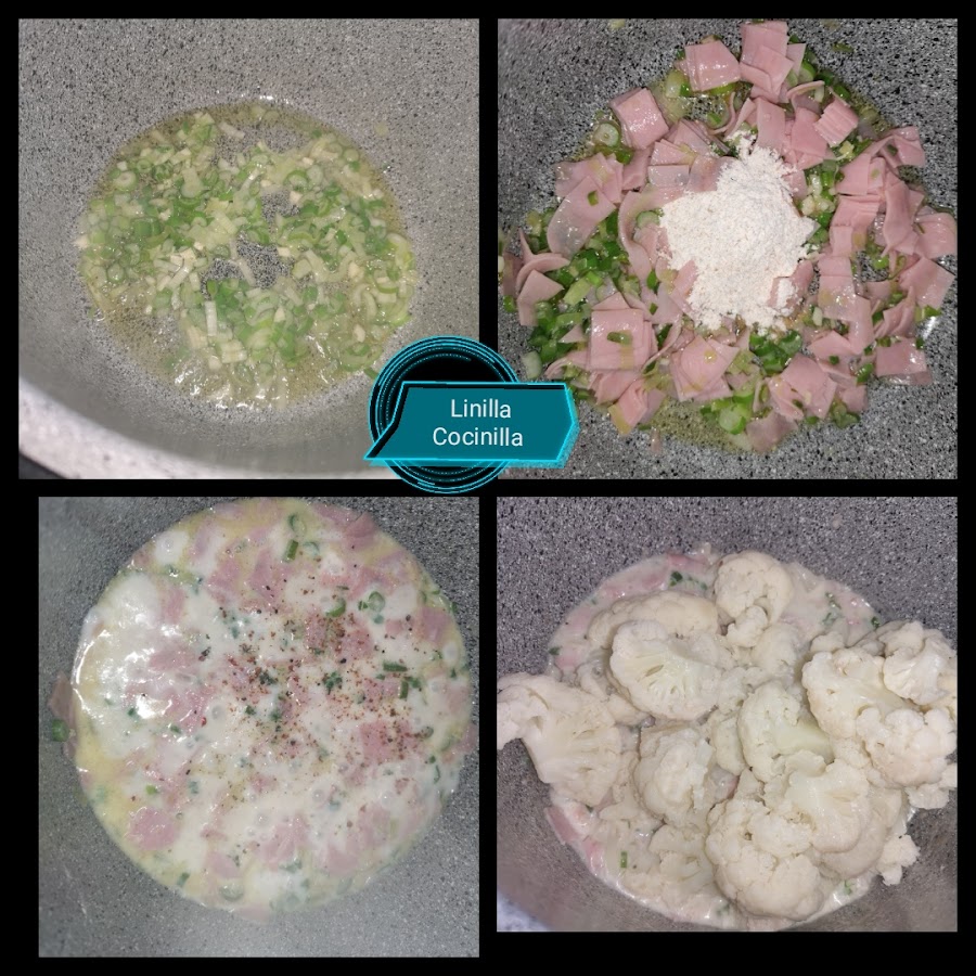 2. Limpiamos y secamos la cubeta. Ponemos el aceite y programamos menú sofreír/15 minutos/140 grados, cuando el aceite alcance la temperatura agregamos la cebolla y sin dejar que se queme mezclamos. Ponemos la harina y damos un par de vueltas y después el jamón de york. Por último la leche, dejamos hervir un par de minutos y ponemos la coliflor, mezclamos y dejamos unos cuantos minutos y cancelamos el menú.