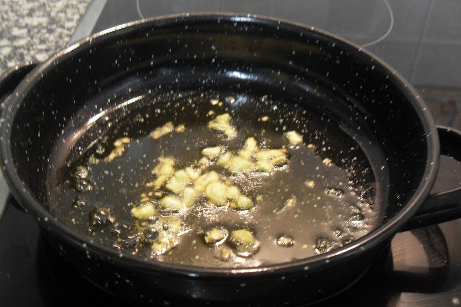 Poner a calentar una sartén con el aceite, incorporar el diente de ajo picado, saltear unos minutos hasta que coja color.