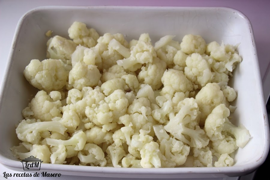 Ponemos a cocer la coliflor en una cacerola con agua hirviendo y un poco de sal. Cocer durante unos 20 minutos o hasta que esté tierna.Para evitar el mal olor que desprende al cocerla os aconsejo añadir un chorrito de leche al agua.