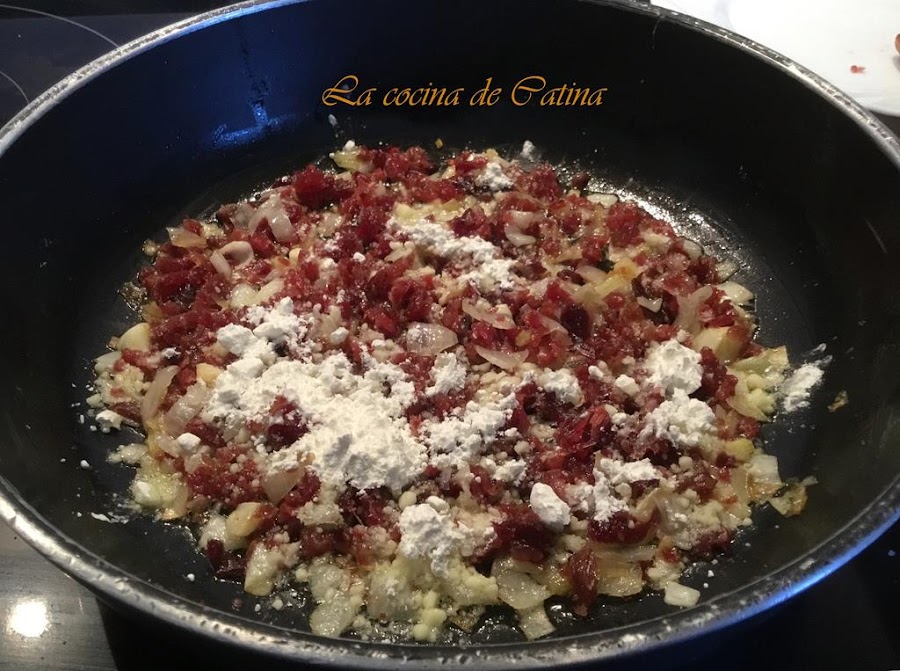 Una vez rehogado, añadimos una cucharada de harina la freímos para que pierda el sabor a harina cruda y le añadimos el tomate frito y el caldo, salpimentamos y dejamos hervir 5 minutos a fuego lento.