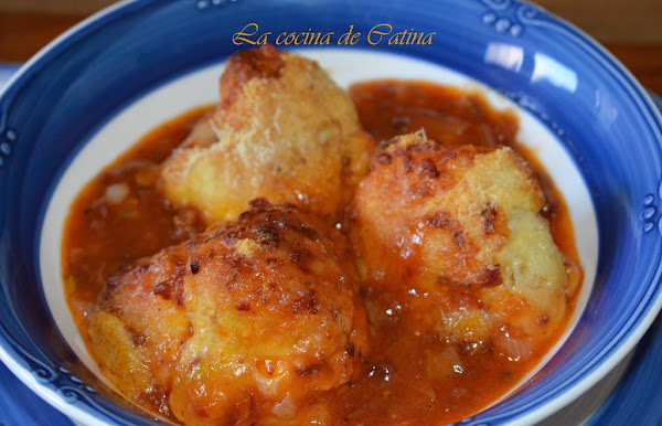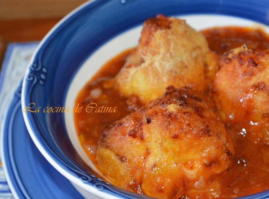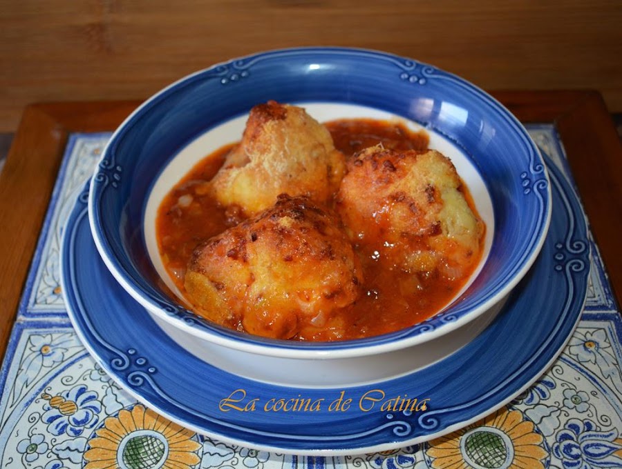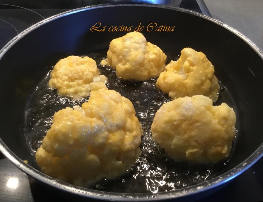 Una vez cocida, la escurrimos bien y pasamos los trozos primero por harina y después por huevo batido, las freímos en abundante aceite caliente y reservamos en una fuente de horno.