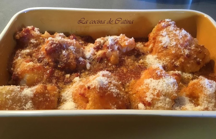 Echamos por encima de la coliflor la salsa, cubrimos con el queso rallado y metemos al horno para gratinar.
