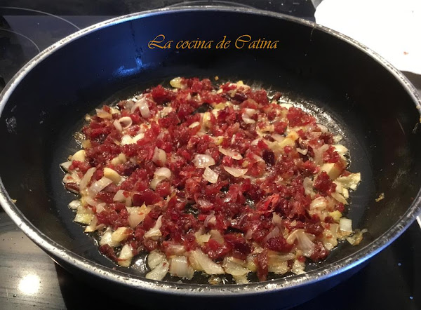 Aparte preparamos la salsa rehogando en las 4 cucharadas de aceite la cebolla bien picadita y el jamón.