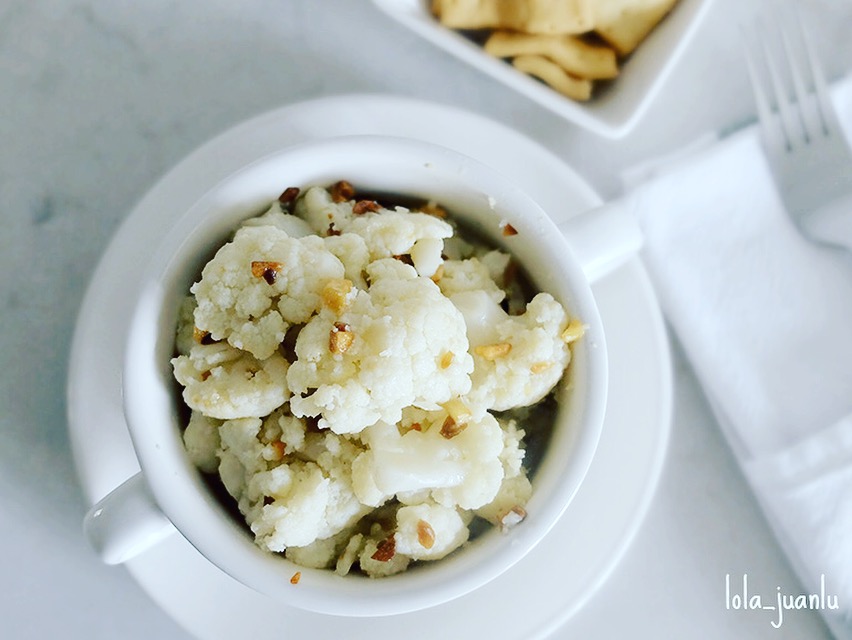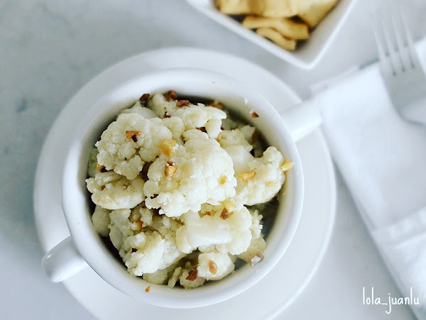 Mientras los ajos están haciéndose, echamos la coliflor en una fuente y la probamos. Si vemos que le falta sabor le añadimos más sal o más vinagre. A mí me encanta el vinagre y le añado 1/2 cucharada de vinagre y 1/2 cucharadita de sal en este momento y remuevo.