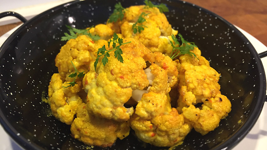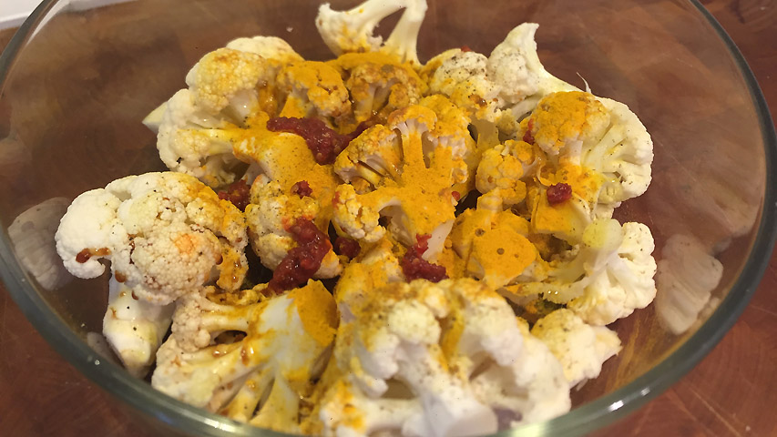 A la bandeja del horno y unos 20-30 minutos a 180º c (356º F) dependiendo si te gusta más o menos hecha la coliflor.