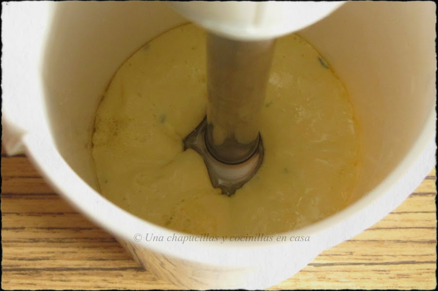 Meter el brazo batidor hasta abajo y ponerlo a máxima potencia, muy importante, dejarlo apoyado en el fondo del vaso sin moverlo, veréis como va emulsionando el aceite, el aceite no emulsionado esta arriba, pues lentamente ir subiendo el brazo batidor hasta que emulsione todo el aceite, repetir con movimientos suaves arriba y abajo hasta que quede mezclada perfectamente.