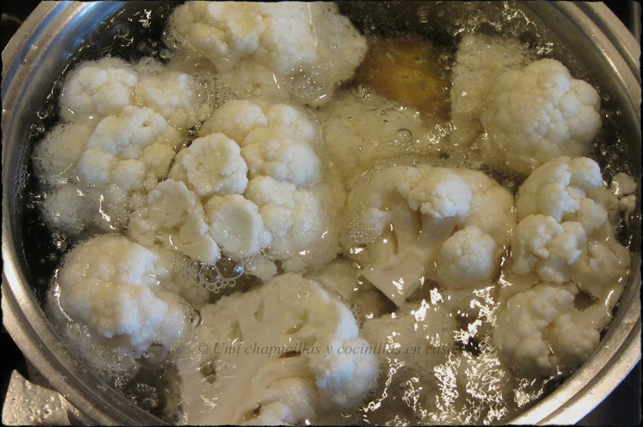 Limpiar las impurezas de la coliflor, separarla en ramilletes y poner a cocer junto con las patatas sin pelar en abundante agua con un poco de sal durante 7-10 minutos