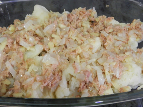 Cuando ya lo tengamos, es hora de montar el plato, en una fuente de horno pondremos la coliflor y a continuación pondremos por encima el salteado que hemos hecho.