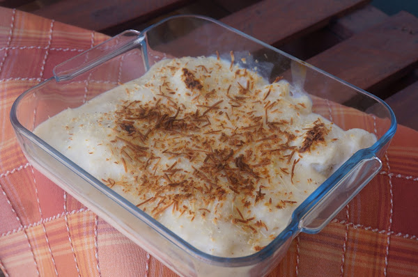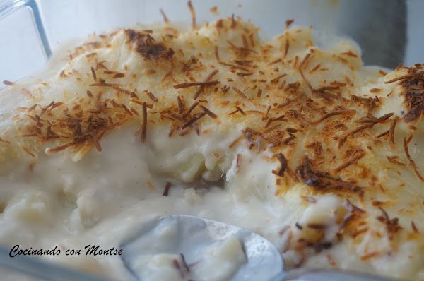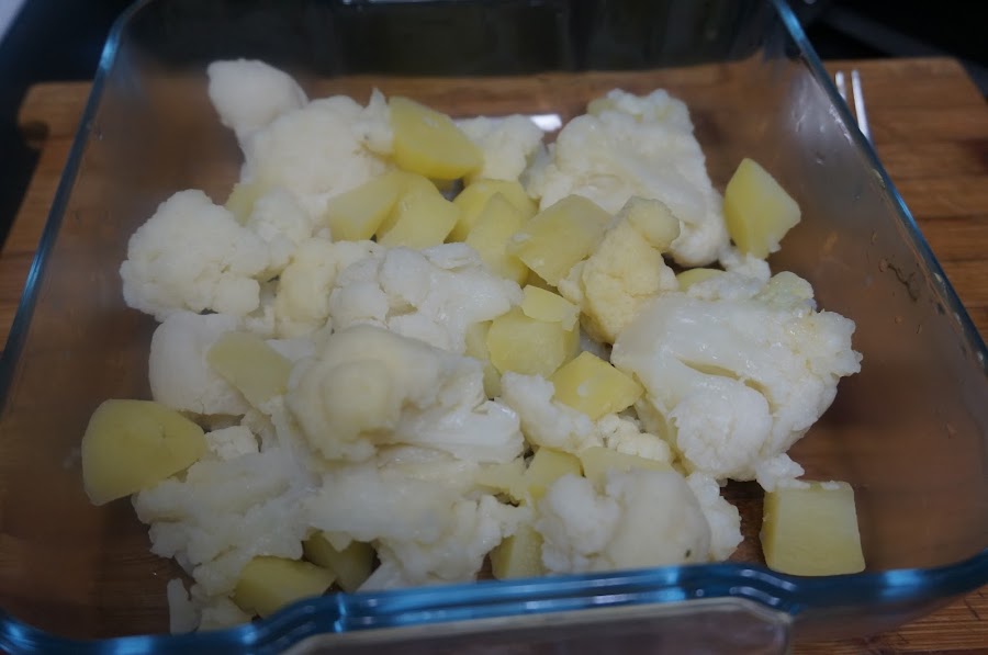 Cuando esté la patata se retira del fuego, para que la coliflor no quede demasiado blanda. La ponemos a escurrir bien. Y lo ponemos en una fuente apta para el horno.