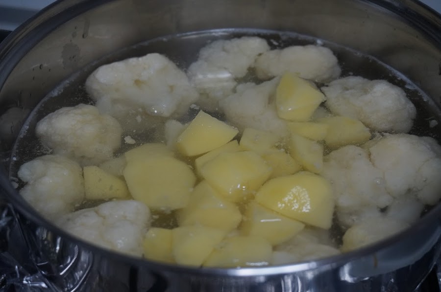 Limpiamos y vamos cortando los troncos de la coliflor, cortamos las patatas en pequeños trozos y lo ponemos en un cazo con abundante agua y un poquito de sal.
