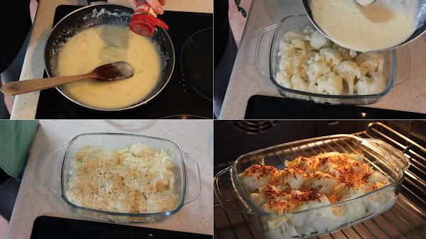 Hacemos la bechamel como dice la receta aqui, La echamos encima de la coliflor y la espolvoreamos con queso rallado.