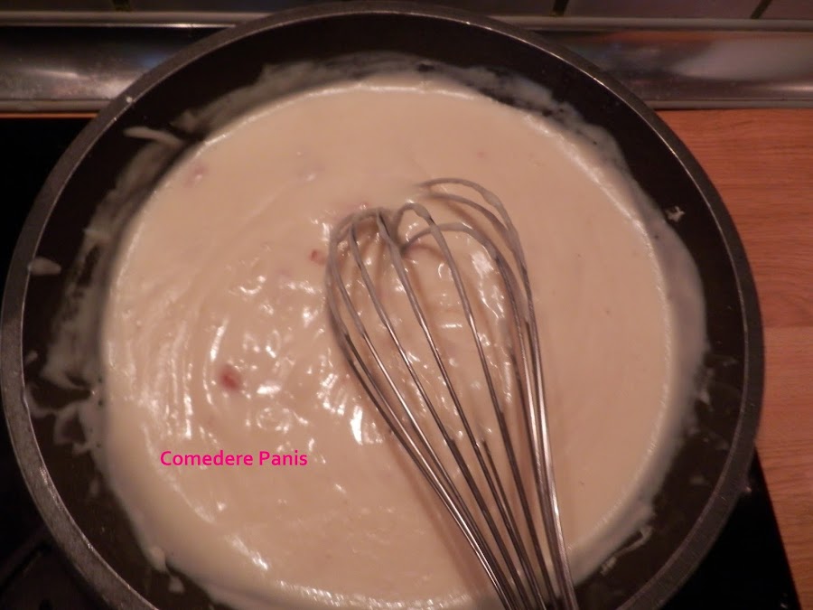 Volcar la leche bien caliente sobre la harina y remover, bajar el fuego a baja temperatura y continuar removiendo mientras la bechamel va espesando.