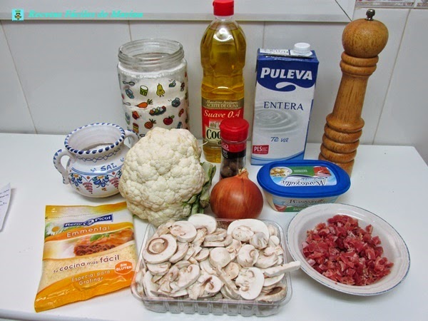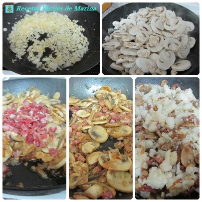 2. Por otro lado se pica la cebolla y se pocha, mientras se cortan los champiñones a trocitos y se añaden a la cebolla rehogandolo todo. Seguidamente se añade el jamón a taquitos y se le dan unas vueltas. Cuando esta hecho se mezcla con la coliflor que hemos reservado.