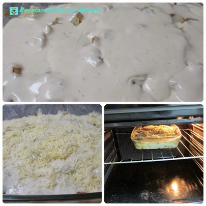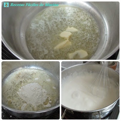 3. Hacer la bechamel, en un cazo se echan los 25 gr de mantequilla, se mueve con un batidor manual, hasta que se derrite, entonces se añade la harina, un poquito de sal, un poquito de pimienta y la nuez moscada. mover sin parar, para que no queden grumos y por último echar la leche, no parar de mover. Si se ha quedado un poco espesa, añadir más leche.