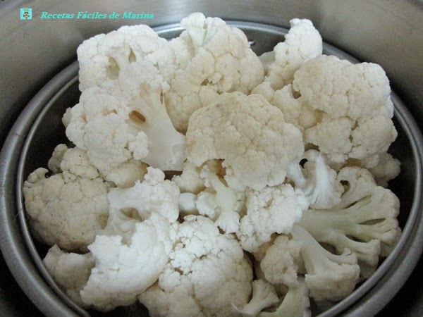 1. Se corta la coliflor y se hierve con abundante agua y un poco de sal durante 20 minutos en olla normal o 7 si es en olla rápida. Escurrir y reservar