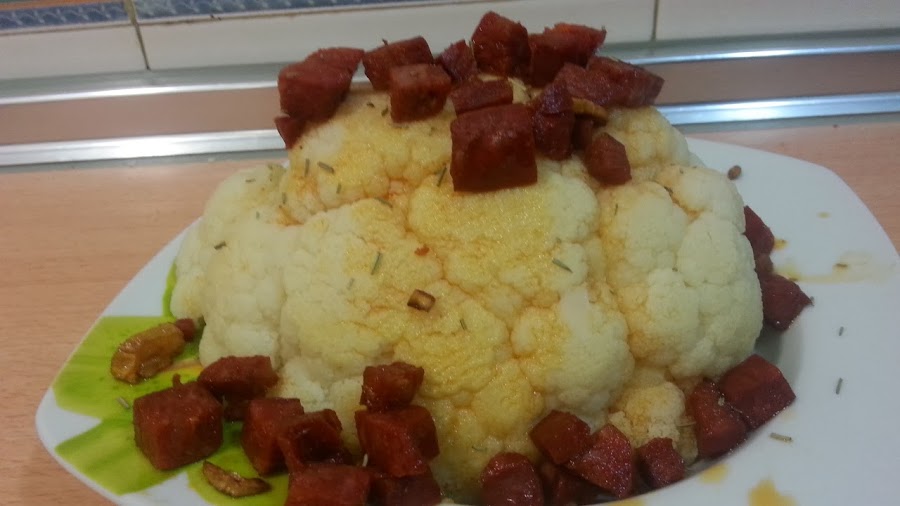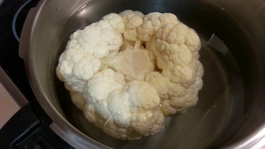 Ponemos la coliflor en la cazuela, salamos y que hierva, id pinchando con un cuchuillo para comprobar que este a vuestro gusto de coccion