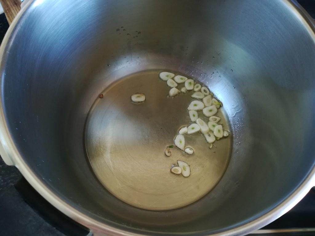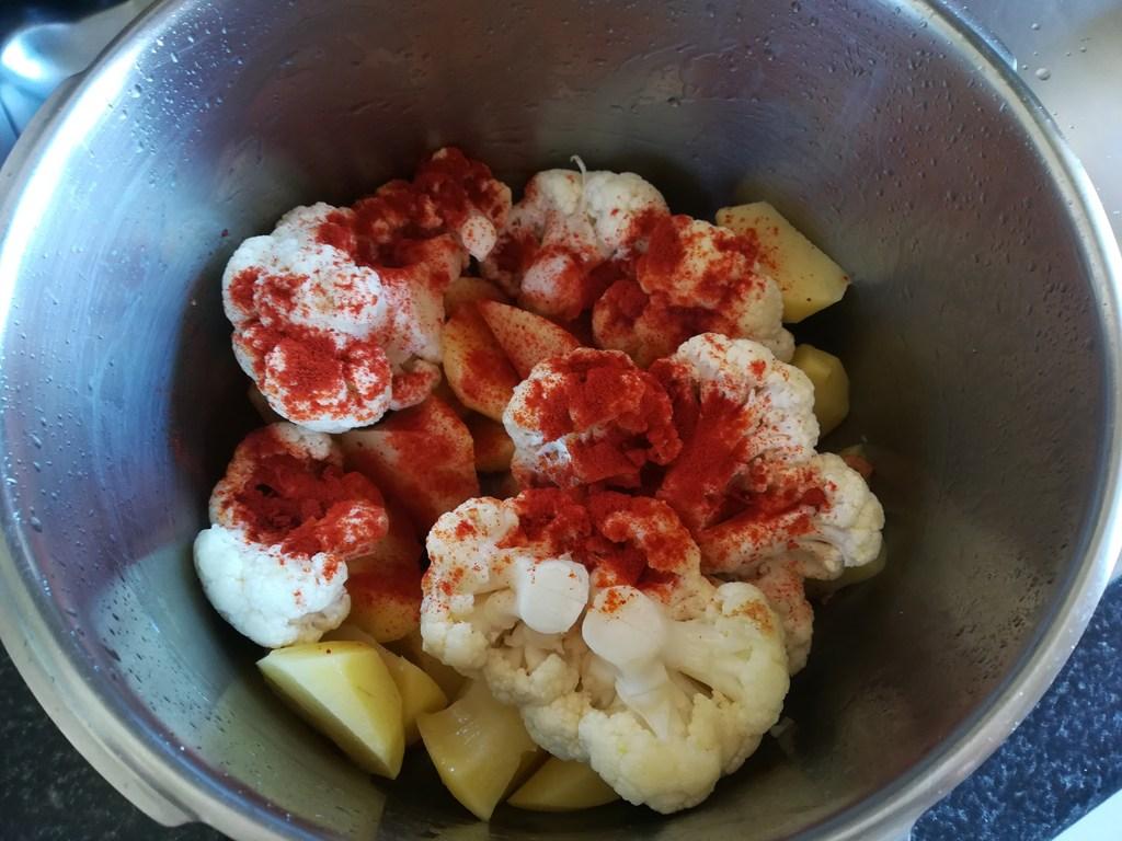 En la olla rápida vertemos aceite de oliva, llevamos al fuego y rehogamos los ajos. Una vez dorados añadimos la coliflor en ramilletes (¡ojo que salpica bastante!) y rehogamos unos minutos.