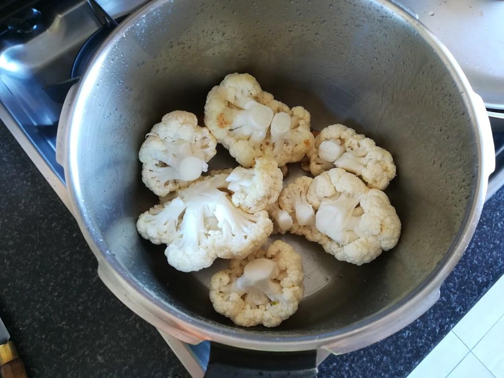 Limpiamos la coliflor y la separamos en ramilletes, reservamos.