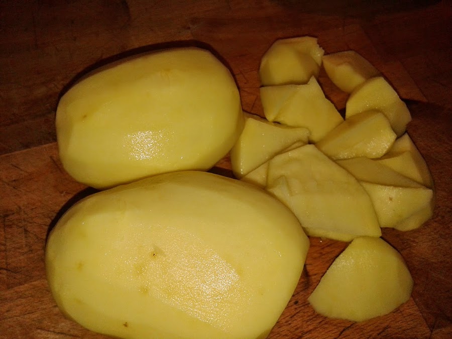 Pelamos, lavamos y cortamos las patatas en trozos mal cortados y las echamos a la olla expres.