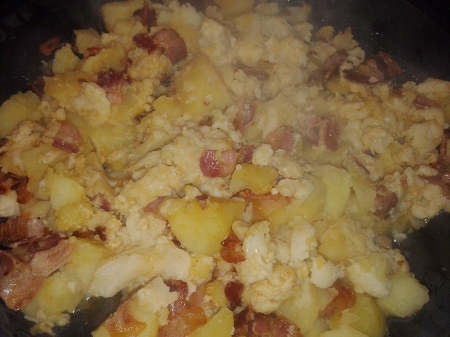 Y ya está, habremos escurrido la coliflor con patatas cocidas, la ponemos en un cuenco grande y le echamos el sofrito por encima. Remover y servir.