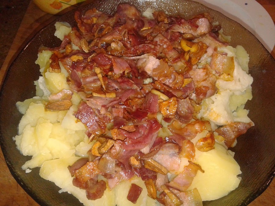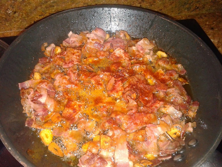 Cuando la panceta o el beicon están bien fritos, retiramos del fuego y añadimos el pimentón.