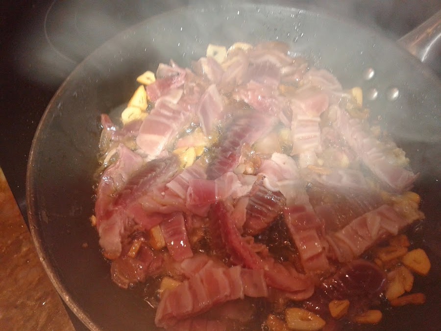 Cortamos la panceta curada en trocitos y la añadimos a la sarten.