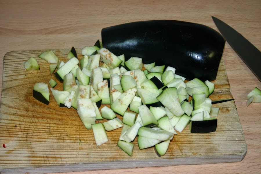 y con la berenjena hacemos lo mismo, lavarla, y trocearla