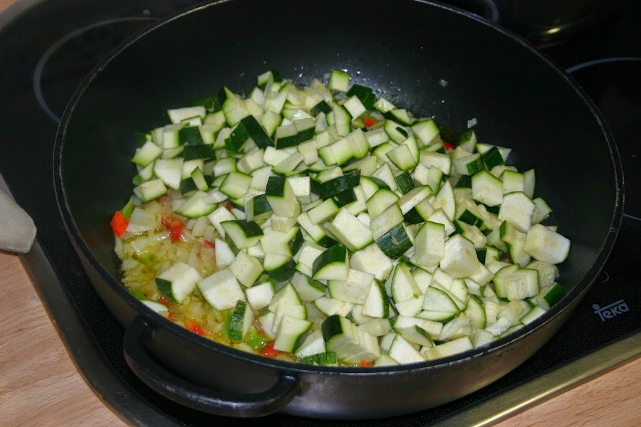 cuando la cebolla y pimientos esten bien pochaditos lo echamos en la sarten