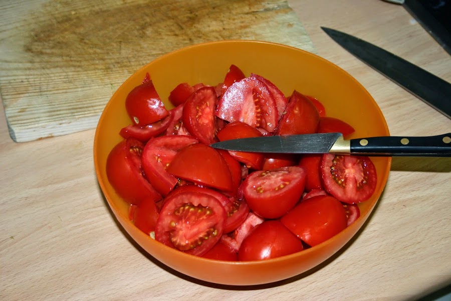 mientras que se va haciendo, cortamos los tomates y los echamos a un bol