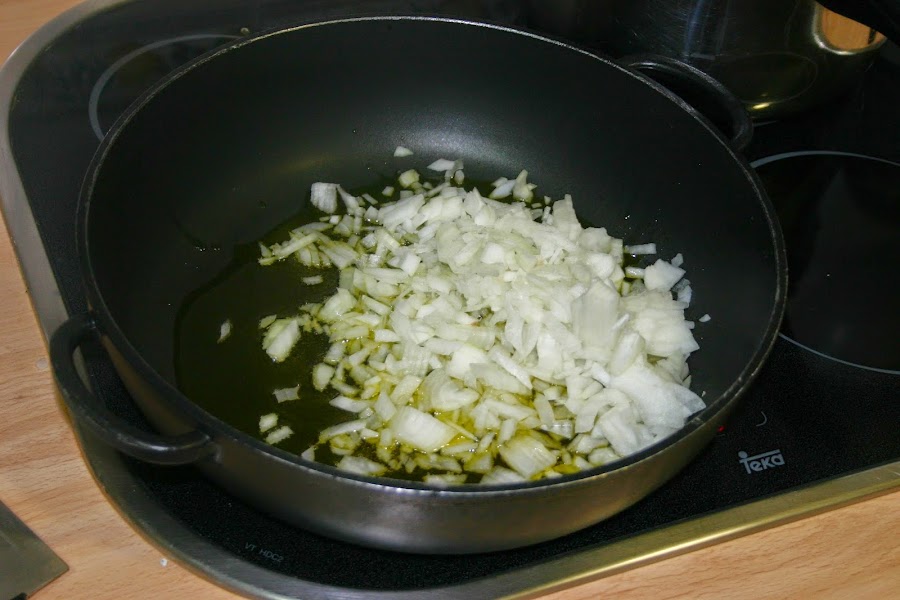 en una fuente grande, echamos aceite, lo ponemos a fuego, 8 sobre 10 y volcamos la cebolla picada y que se vaya pochando