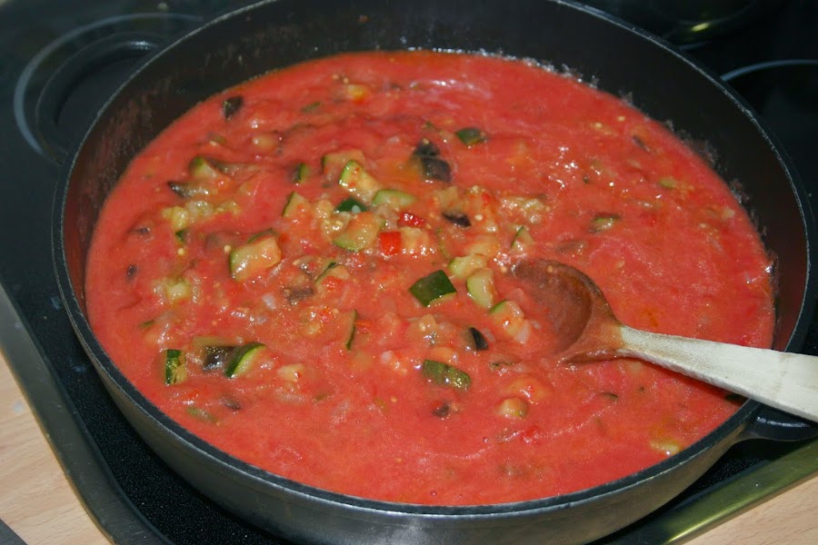 y cuando las verduras esten bien pochadas agregamos el tomate a la sarten, echamos sal y azucar, mas o menos la misma cantidad que de sal, depende de como os guste, yo suelo echar el doble de azucar que de sal