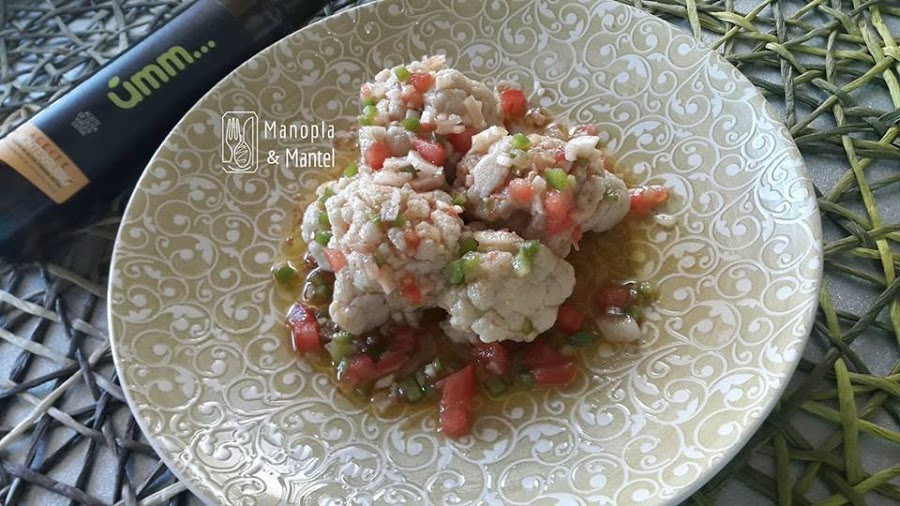 Añadimos el vinagre y el aceite y removemos bien. Añadimos las verduras picaditas y mezclamos todo bien dejando que se tomen los sabores unos minutos. Echamos encima de la coliflor.