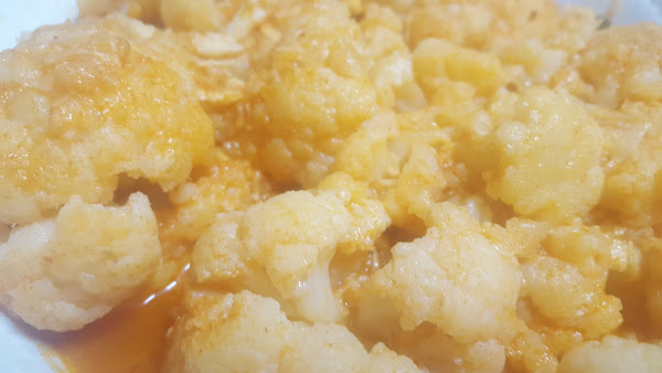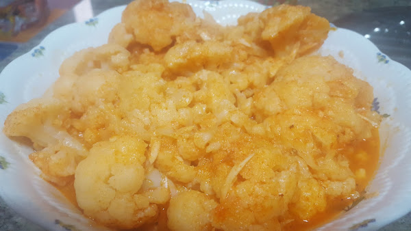 Iremos poniendo una sartén con un chorrito de aceite de oliva virgen extra a calentar y añadiremos 4 0 5 ajos con la piel(esto también dependerá del tamaño de la coliflor) y un trozo de pan,cuando estén dorados lo pasamos al mortero con cominos y pimentón dulce(podéis echarle del picante también le da un punto riquisimo) se hará una masa le agregáis el vinagre y agua de la misma cocción.