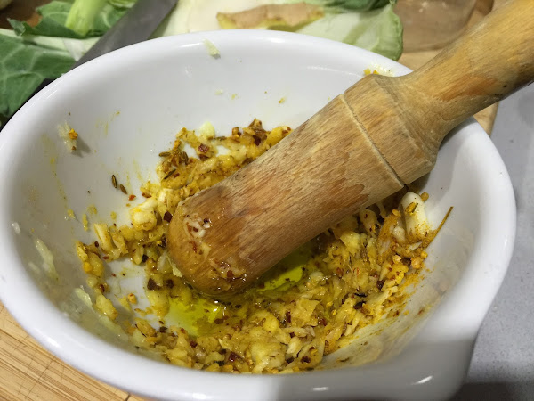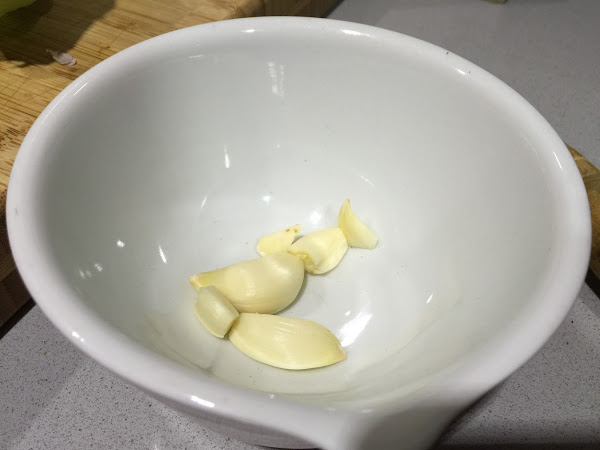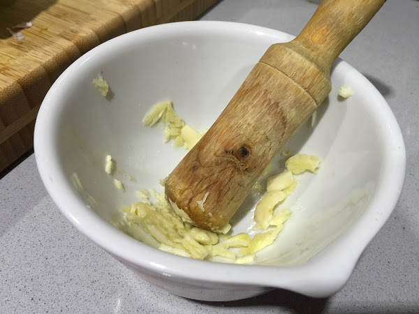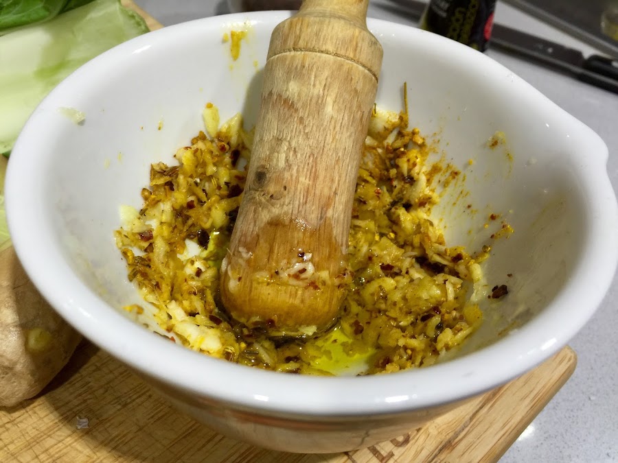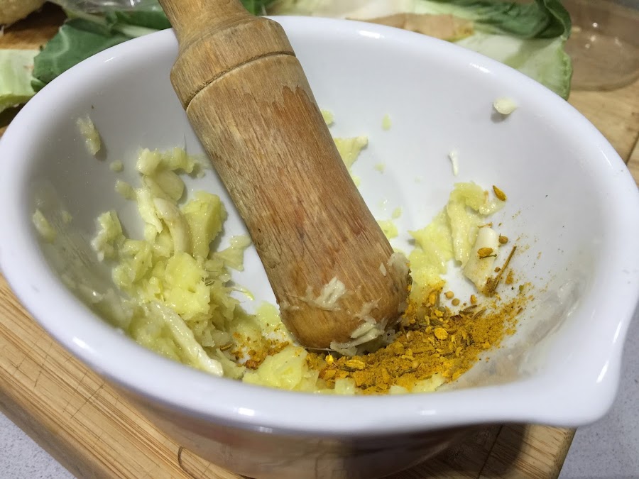 2. Colocamos en un mortero los 4 dientes de ajo pelados, los machamos bien. A continuación añadimos el jengibre fresco en láminas y lo majamos junto con el ajo.