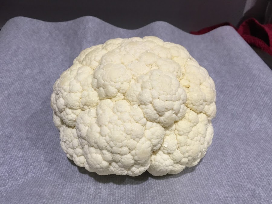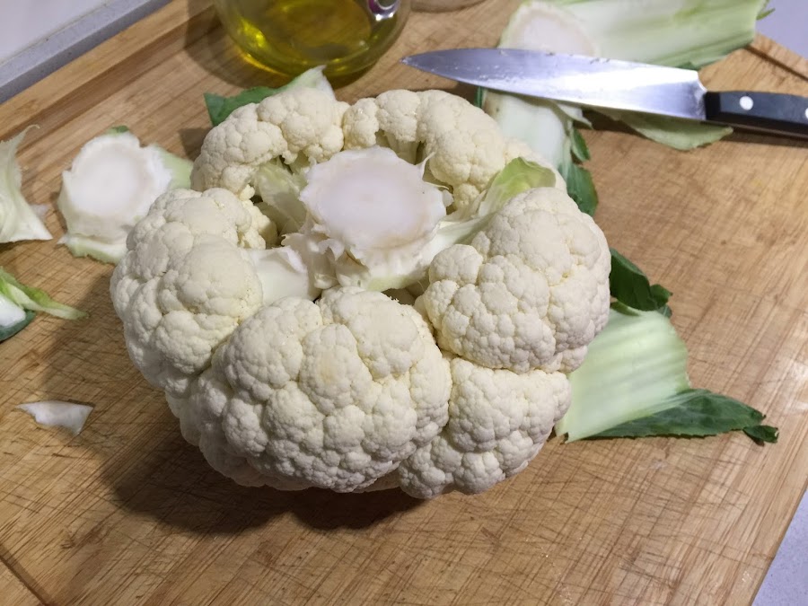 1. Precalienta el horno a 190ºC arriba y abajo. Para hacer esta receta conviene usar una coliflor grande, de aproximadamente 1kg. Empezamos retirando las hojas de la parte inferior de la coliflor. Debemos cortar con cuidado las hojas y solo una parte del tallo. Nos interesa que coliflor mantenga su forma y no se deshaga. Lavamos bien la coliflor con agua fría.