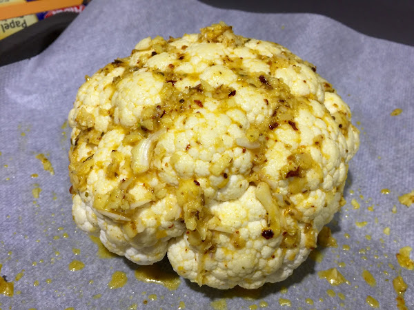5. Colocamos la coliflor limpia sobre una bandeja de horno cubierta de papel de horno. Embadurnamos bien con las manos toda la superficie con el majado que hemos preparado. Asegúrate de llegar a todos los rincones.