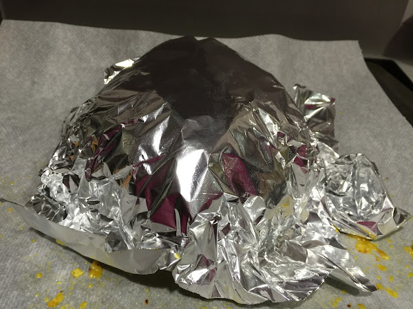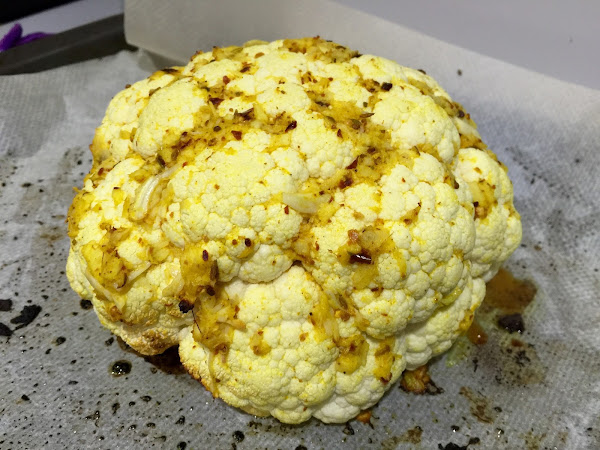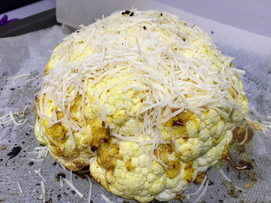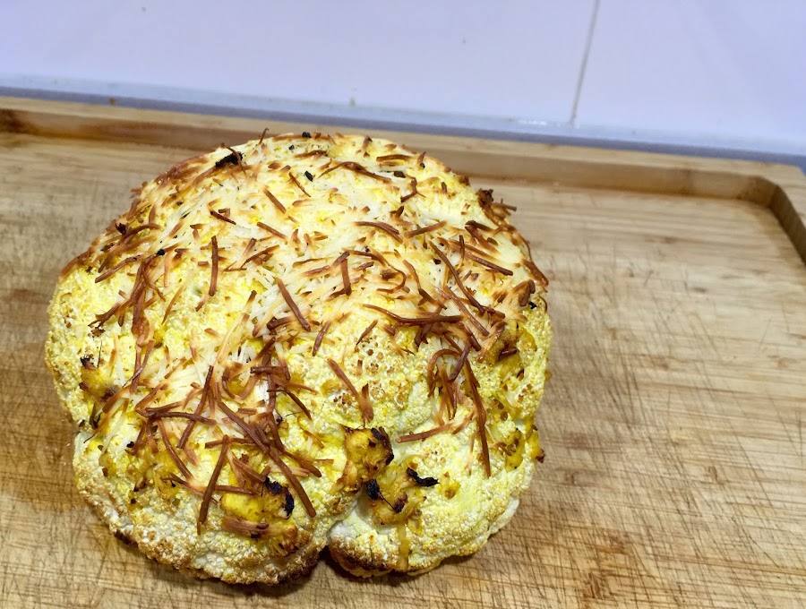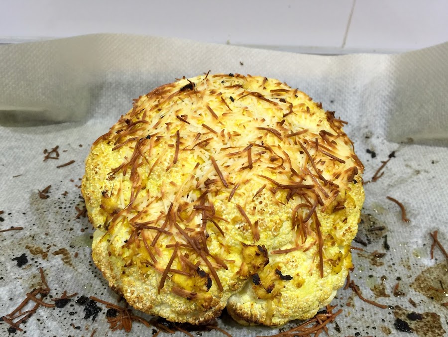 6. Cubrimos la coliflor con papel de aluminio y horneamos a 190ºC durante 40 minutos. Pasados los 40 minutos retiramos el papel de aluminio y cubrimos con el queso rallado. Horneamos durante 25 minutos más.