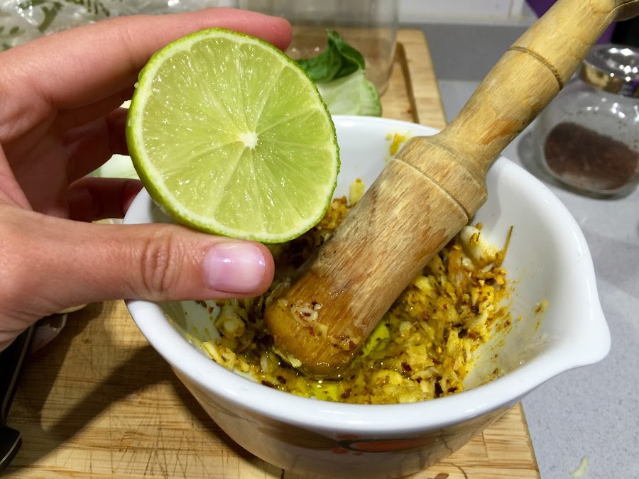 4. Finalmente añadimos la sal, el aceite de oliva y el jugo de lima. Debe quedar una pasta bien majada.