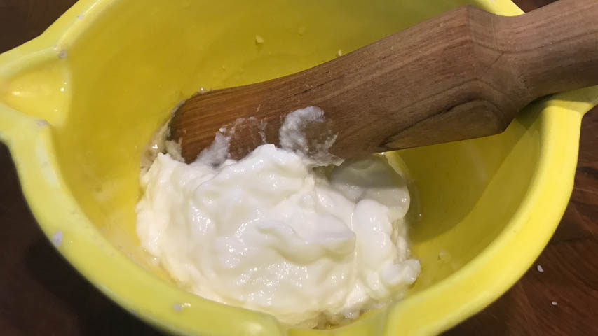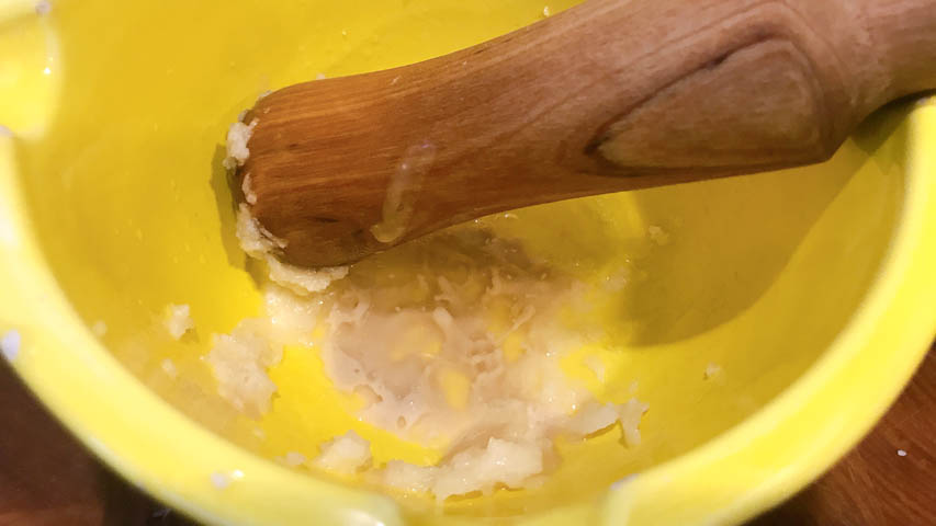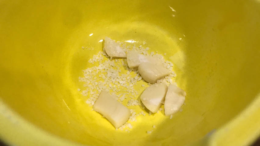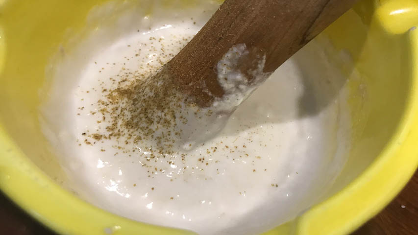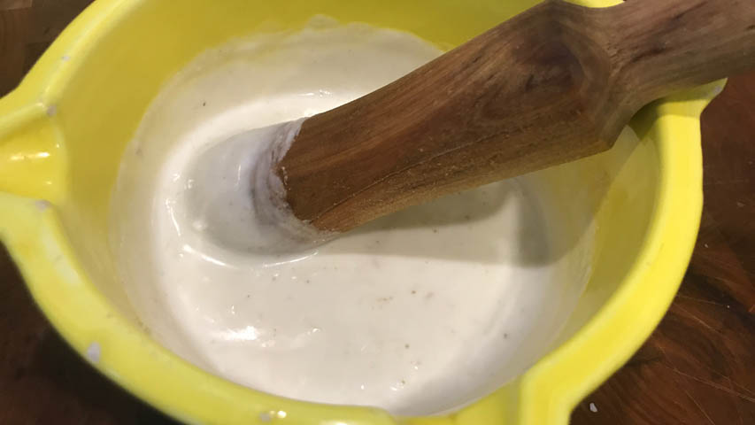 En un mortero machaca un ajo con un poco de sal. Añade el tahini, el zumo de limón, el yogur, el comino y mezcla bien.