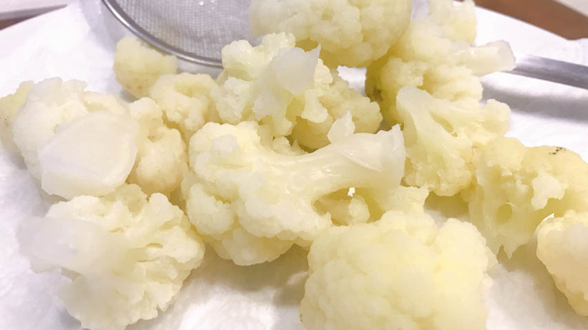 Saca los ramilletes a la coliflor y cuécelos en agua sin sal hasta que estén “al dente”. Retira y escurre. Déjalos reposar en papel absorbente. Sécalos con otro papel.