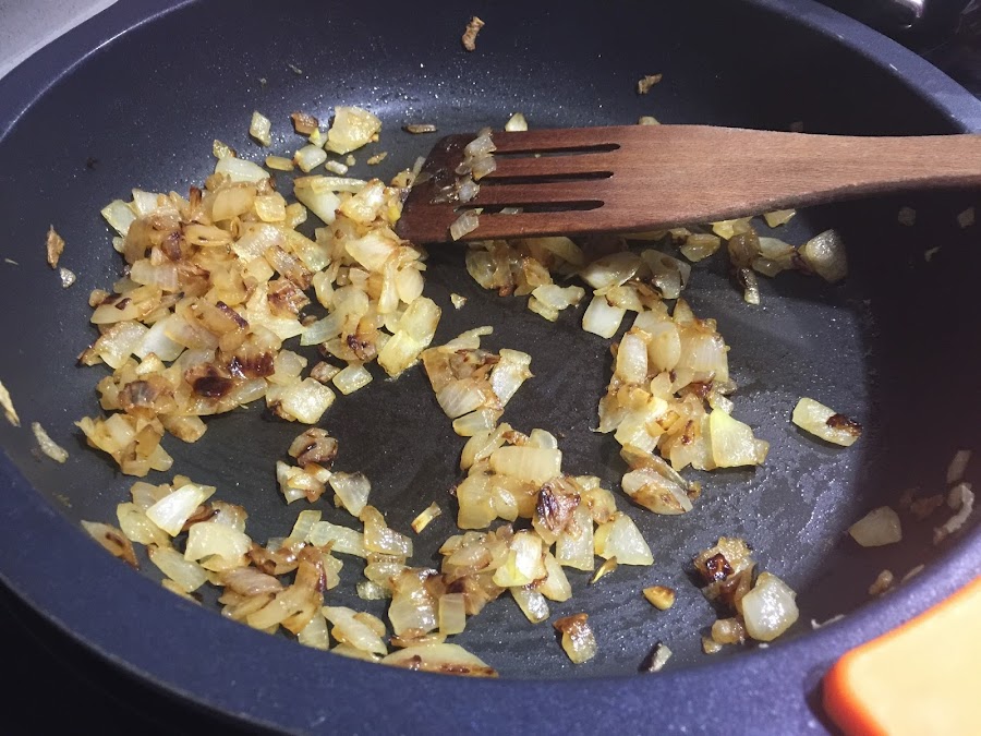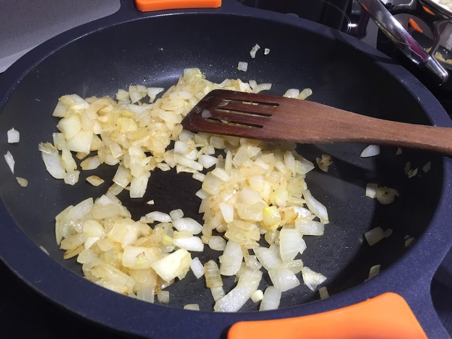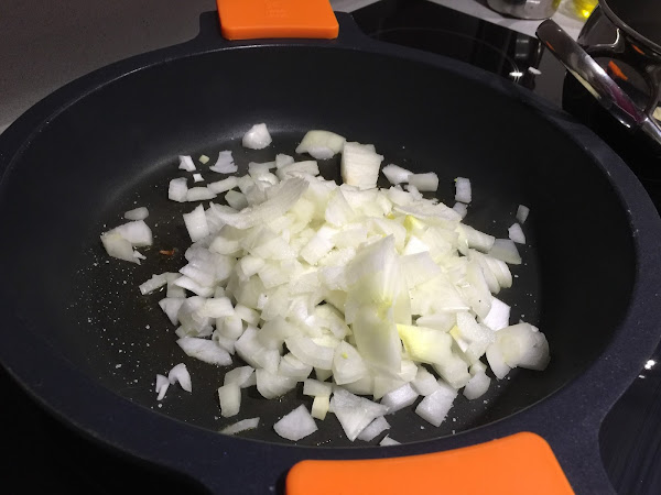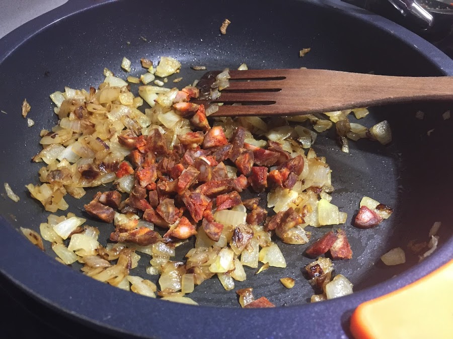 5.En una cazuela sofreímos la cebolla blanca, que previamente hemos cortado a trocitos pequeños, con un par de cucharadas de aceite de oliva virgen extra. A fuego lento hasta que tome un color dorado. Añadimos los trocitos de chorizo curado picante y rehogamos durante 1 minuto.
