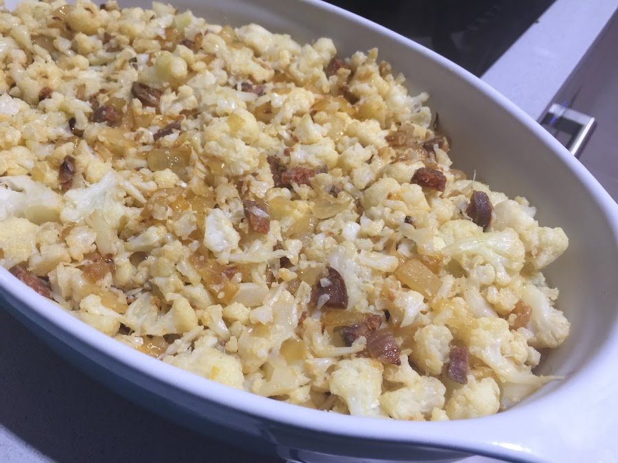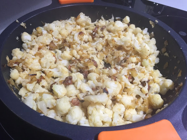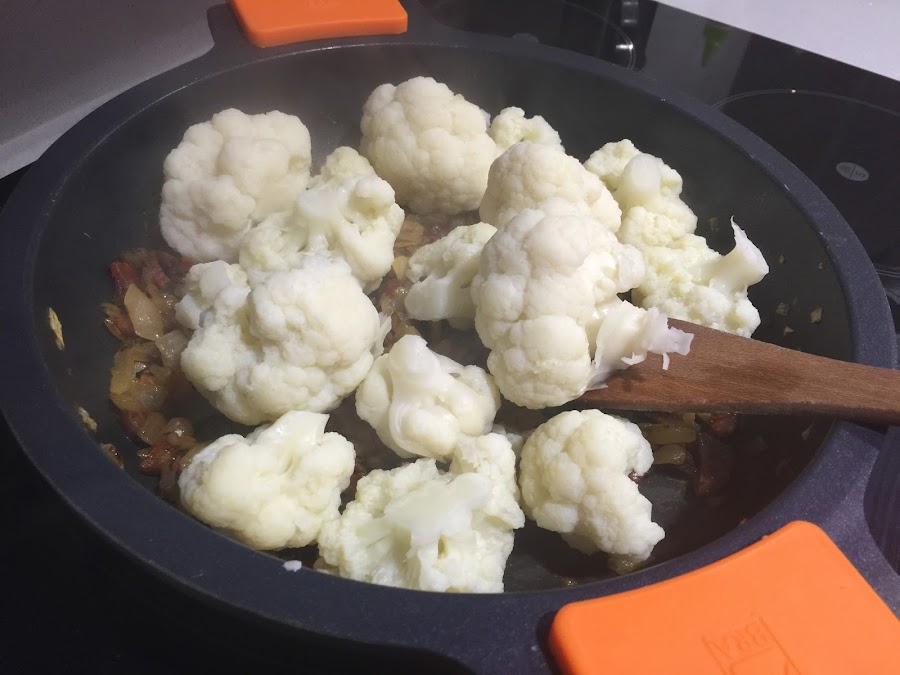 6.Añadimos al sofrito la coliflor, rehogamos durante 3-4 minutos, hasta que quede todo el sofrito bien repartido.