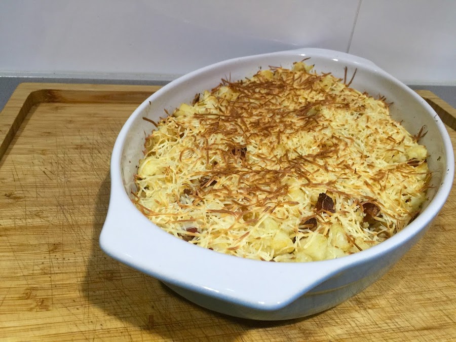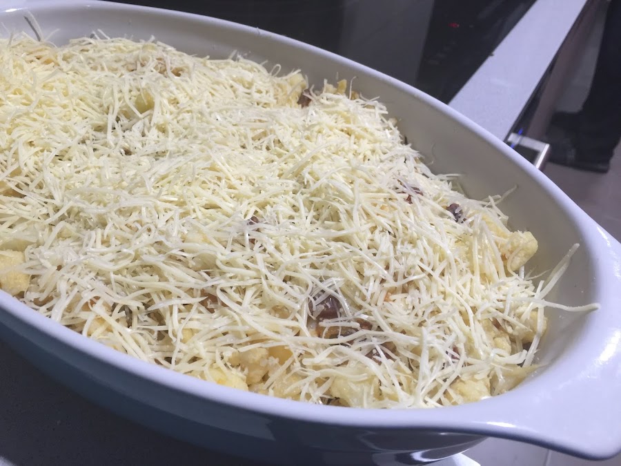 7.Ponemos en una fuente de horno y gratinamos con queso emmental rallado durante 10-12 minutos, hasta que el queso quede tostadito.