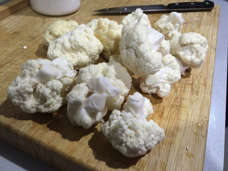 2.Cortamos la coliflor en trozos. Para cocer la coliflor adecuadamente, lo ideal es cortarla en varios trozos, en 6 o 8 trozos.