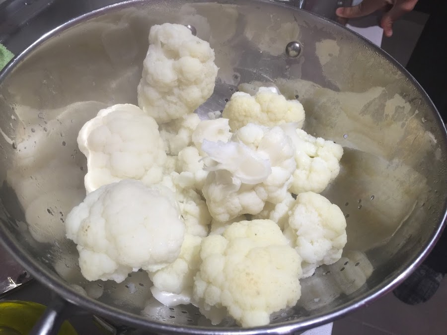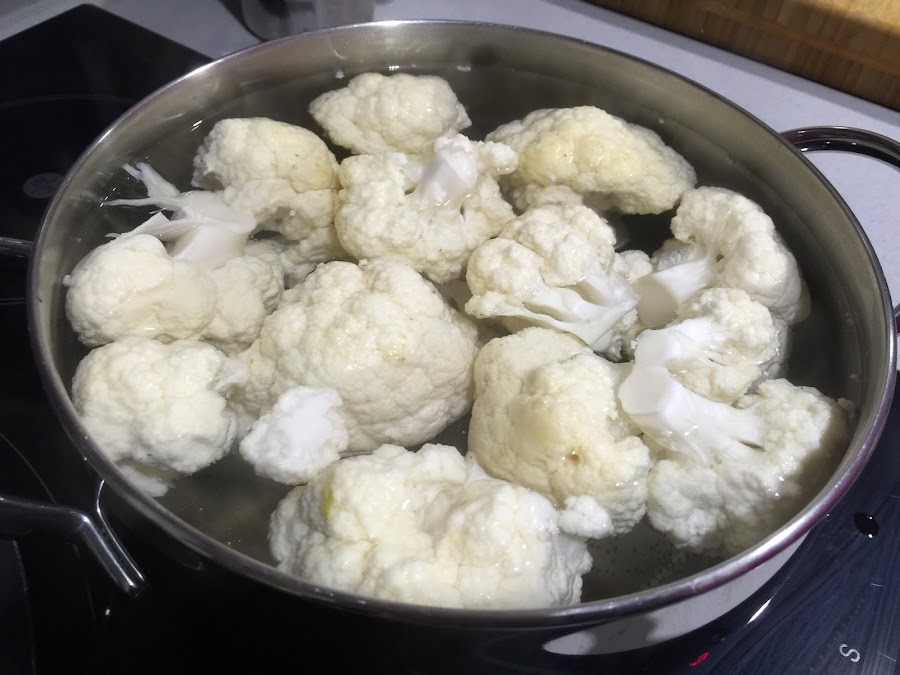 3.Ponemos la coliflor en una olla y la cubrimos con agua fría.Salamos y la ponemos al fuego.