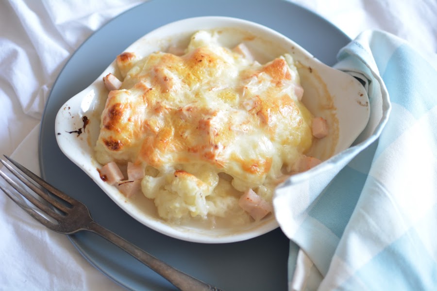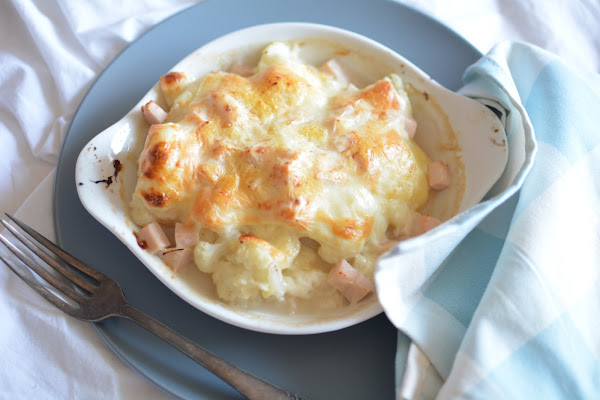 Ponemos la coliflor y la patata en trocitos en un recipiente apto para el horno. Añadimos taquitos de jamón dulce. Finalmente rociamos la bechamel de arroz por encima y un poquito de queso light o proteico rallado.