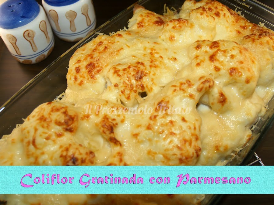 Por último rallamos Queso Parmesano y lo espolvoreamos por encima de la coliflor que ya esta napada con la Salsa bechamel. Metemos en el horno 10 min. para que se caliente y a continuación cambiamos la función a gratinar y cuando el queso este dorado tendremos nuestro plato listo, que serviremos inmediatamente.