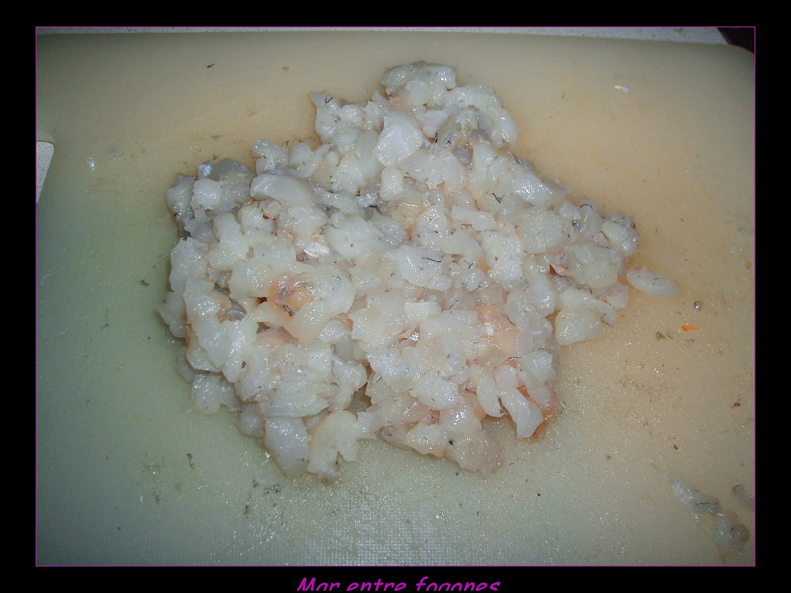 Después de limpiar el bacalao fresco de piel y espinas, lo partimos en trocitos muy pequeños con el cuchillo.