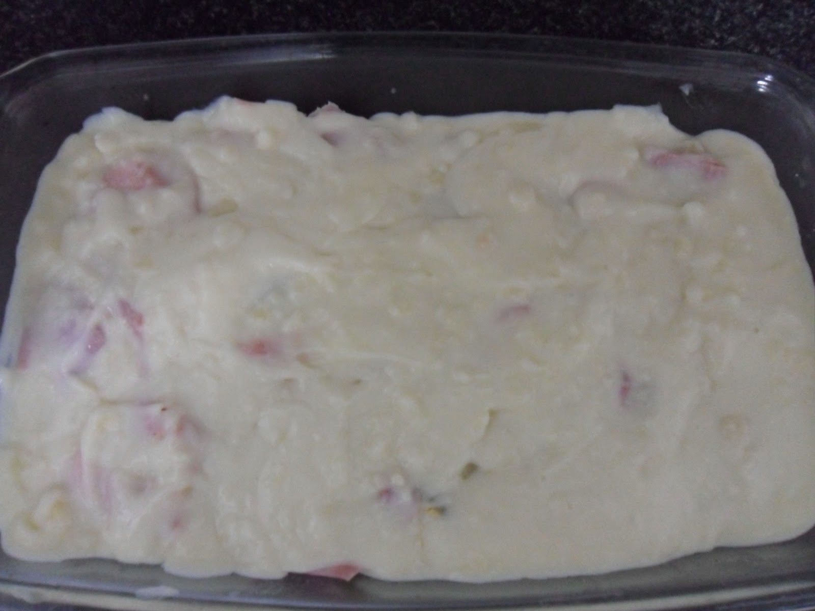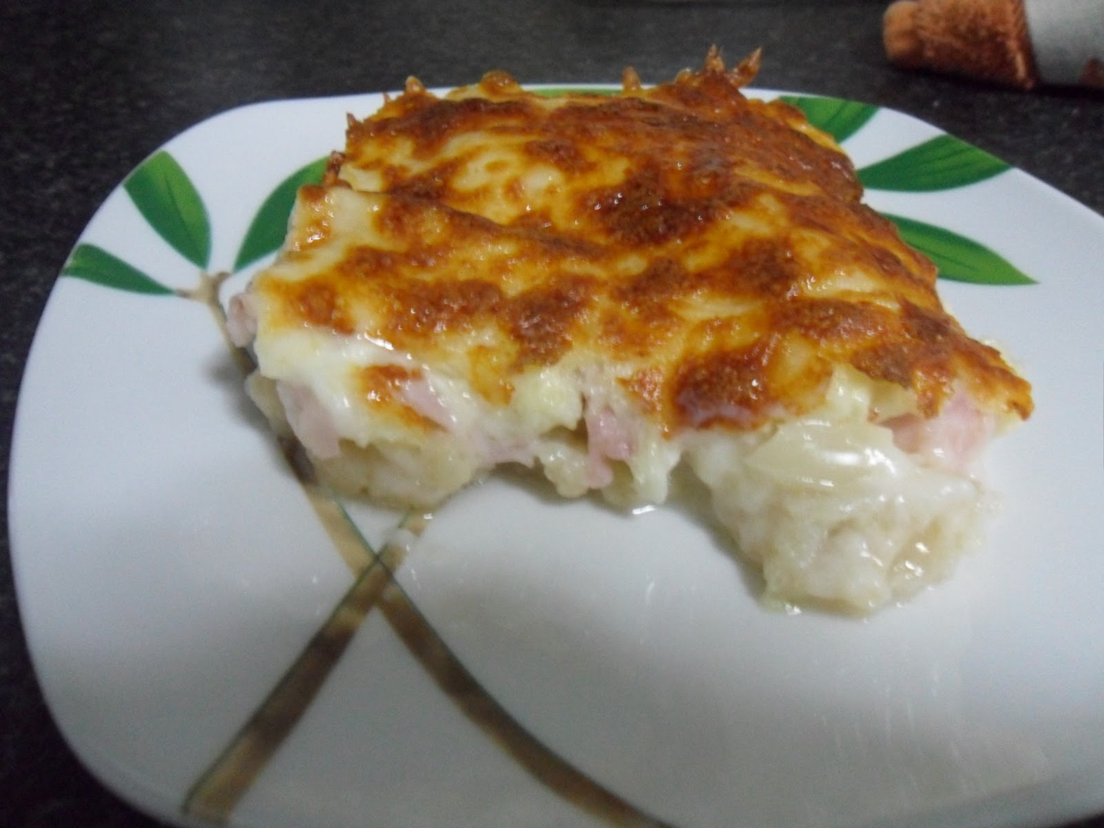 4º - Ahora troceamos el jamón york y lo añadimos encima de la coliflor , vertemos la bechamel cubriendo todos los ingredientes y espolvoreamos la mozzarella y un poco de pan rallado . ( Debe ir quedando de la siguiente manera ) :