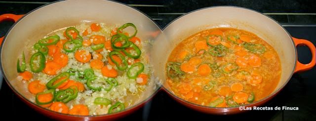 En una cazuela baja y amplia echamos aceite de oliva, lo justo para que cubra el fondo. Picamos la cebolla y el ajo muy menudo y ponemos a freír, lentamente. En una vitrocerámica del 1 al 9 haremos este plato en el número 4. Salamos ligeramente. Revolvemos de vez en cuando. Cuando la cebolla esté pochada añadimos la zanahoria y a los cinco minutos el pimiento verde. Dejamos que se haga todo muy bien. Echamos una cucharada tamaño café de pimentón de La Vera y regamos con un vaso de vino blanco, dejando que se evapore el alcohol.